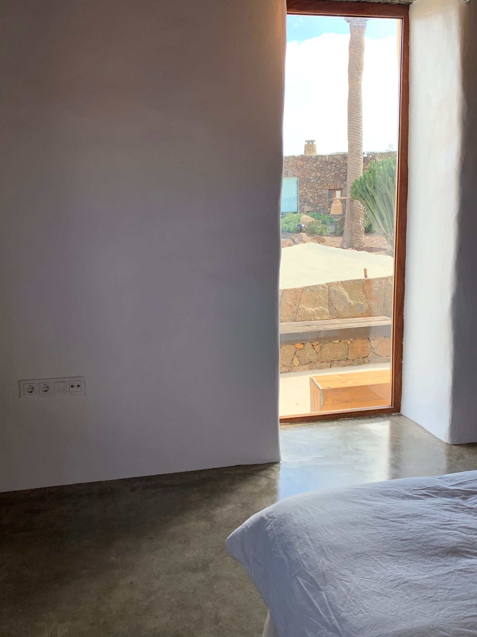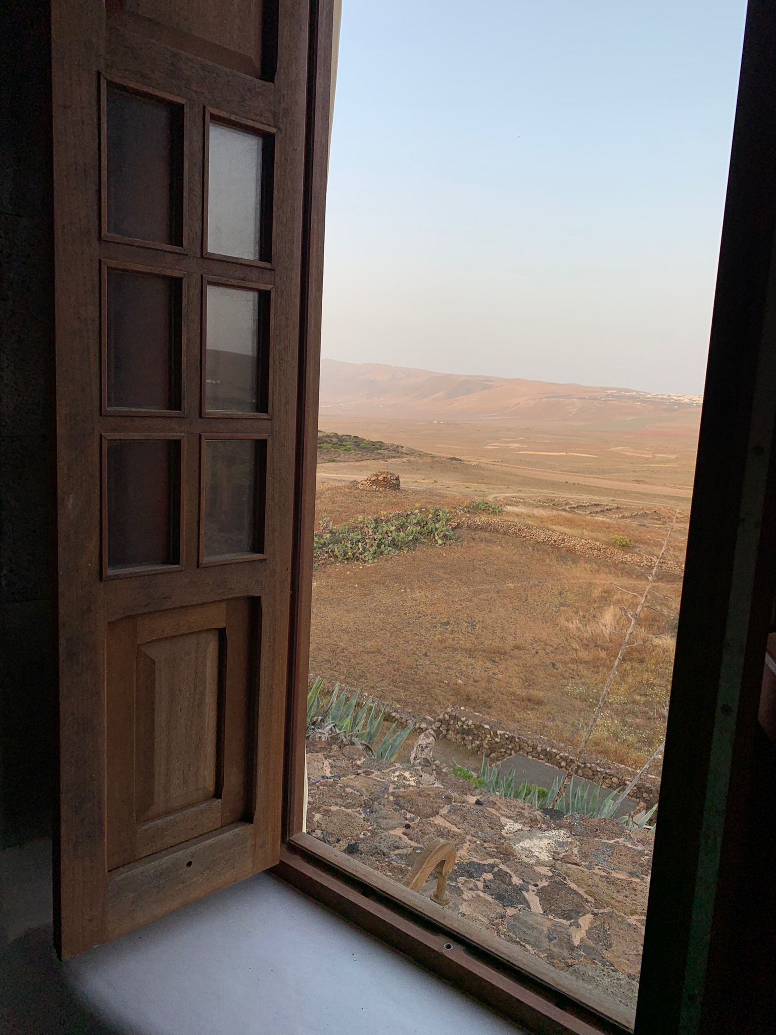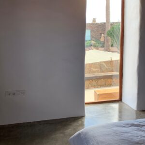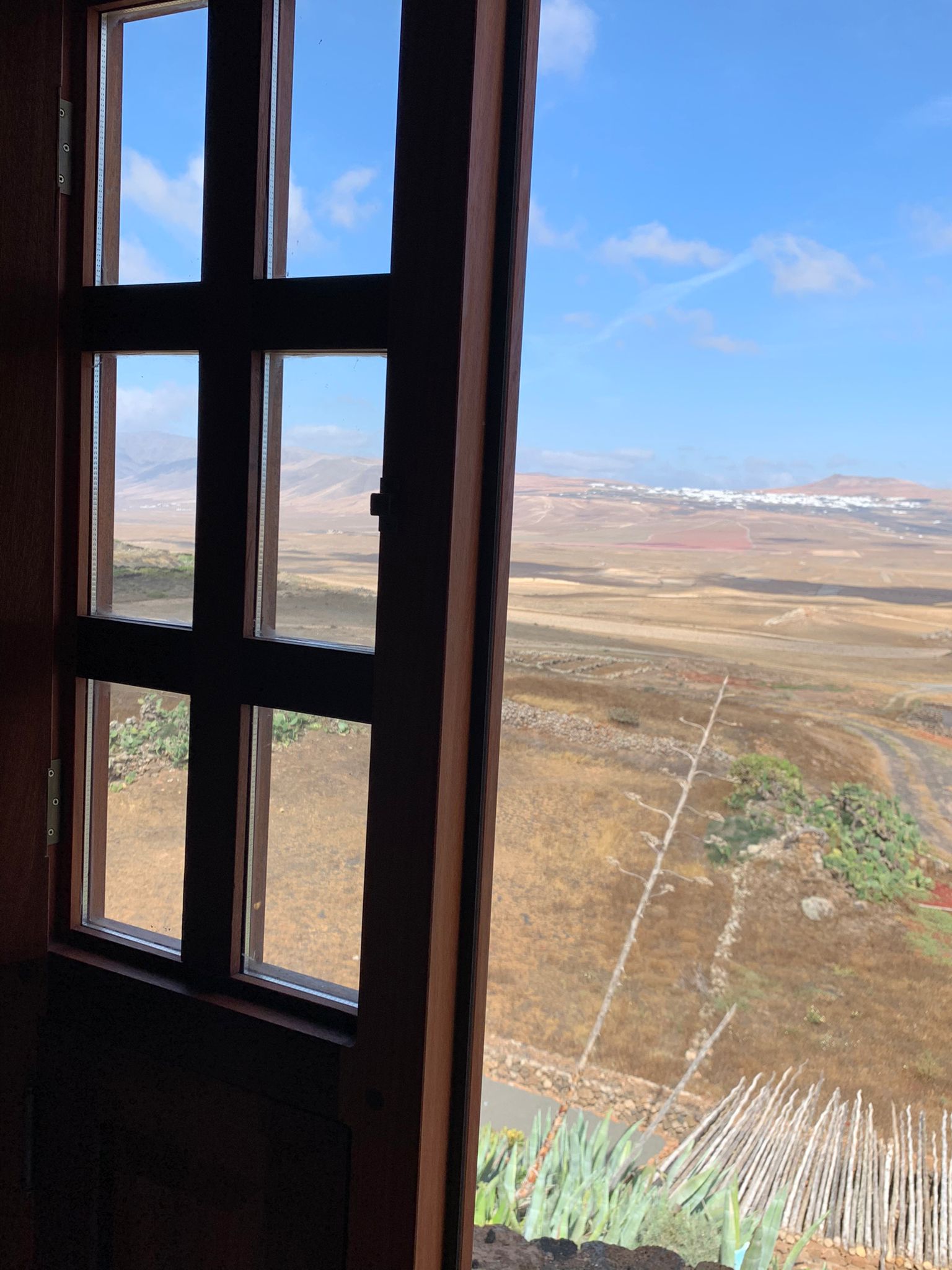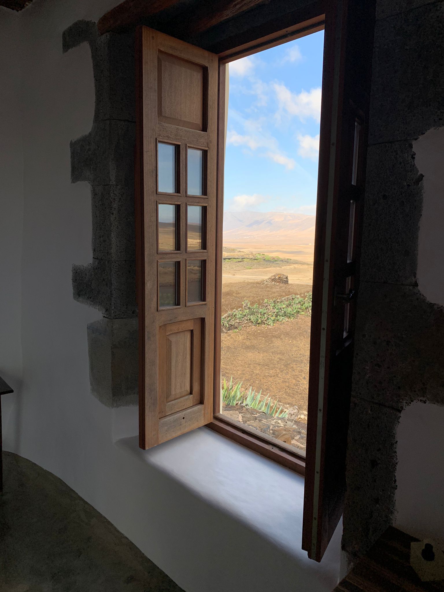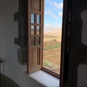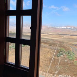 Dormitorio muy amplio, con una gran ventana desde la que se divisa el paisaje del jable y al fondo, la antigua capital de la isla de Lanzarote, La Villa de Teguise, con el Castillo de Santa Bárbara que corona el alto de la montaña de Guanapay.